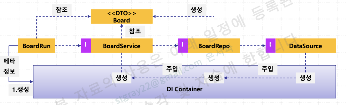 Controller에서 Service를 부르고 Service에서 Repo를 불러 디비에 접근하는 방식이다. 따로 객체를 생성할 필요 없이 @Autowired를 통해 주입해주면 쓸 수 있다.